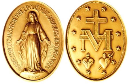 Modelo de medalla que Nuestra Señora encargó acuñar a Catherine Labouré el 27/11/1830, indicándole que las personas que lleven ésta medalla con fe, gozarán de una especial protección.